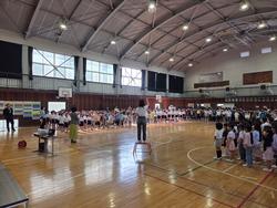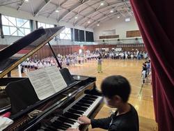 今朝の音楽朝会は、全校児童で校歌を歌いました。